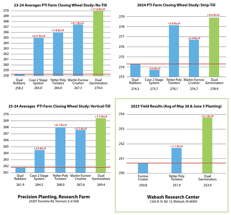 Recently a Midwest company conducting high-quality practical agricultural research reported that using a superior performing closing wheels such as Germinator® closing wheels was the most cost-effective solution with the quickest most immediate rate of return, for enhancing corn or soybean production and profitability. Their research showed, closing wheels such as Germinator® could increase corn production as much as 5.1 bushels per acre and soybean production 2.5 bushels per acre.